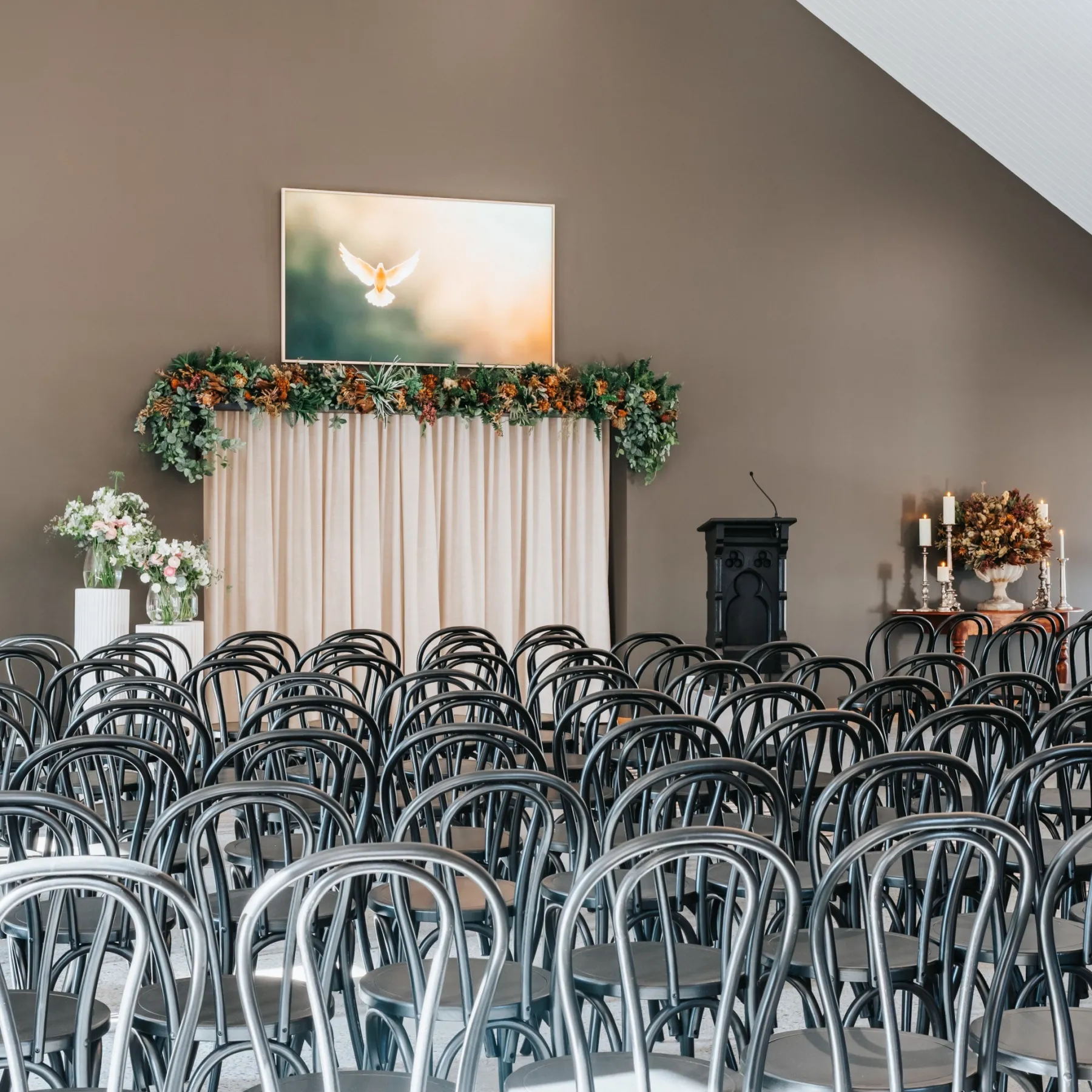 Our Westella Chapel is a beautiful modern barn inspired space, that is spacious with high ceilings, wood fire and a private family room to gather in prior to a funeral. A great size to host all types of funerals from large to small. All set in a peaceful setting adjacent to Westella House.